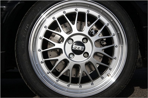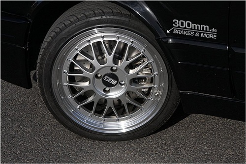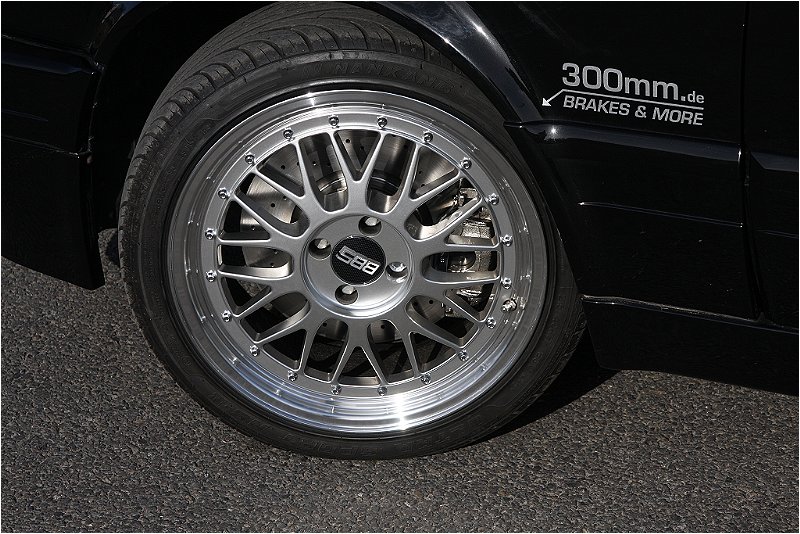 Die 312mm Bremsanlage an der Vorderachse erfordert bei den zu verwendenden Felgen im Normalfall 17 Zoll. Im Foto sind 17 Zoll BBS Le Mans Replika Felgen zu sehen, welche ohne Spurplatten passen.
